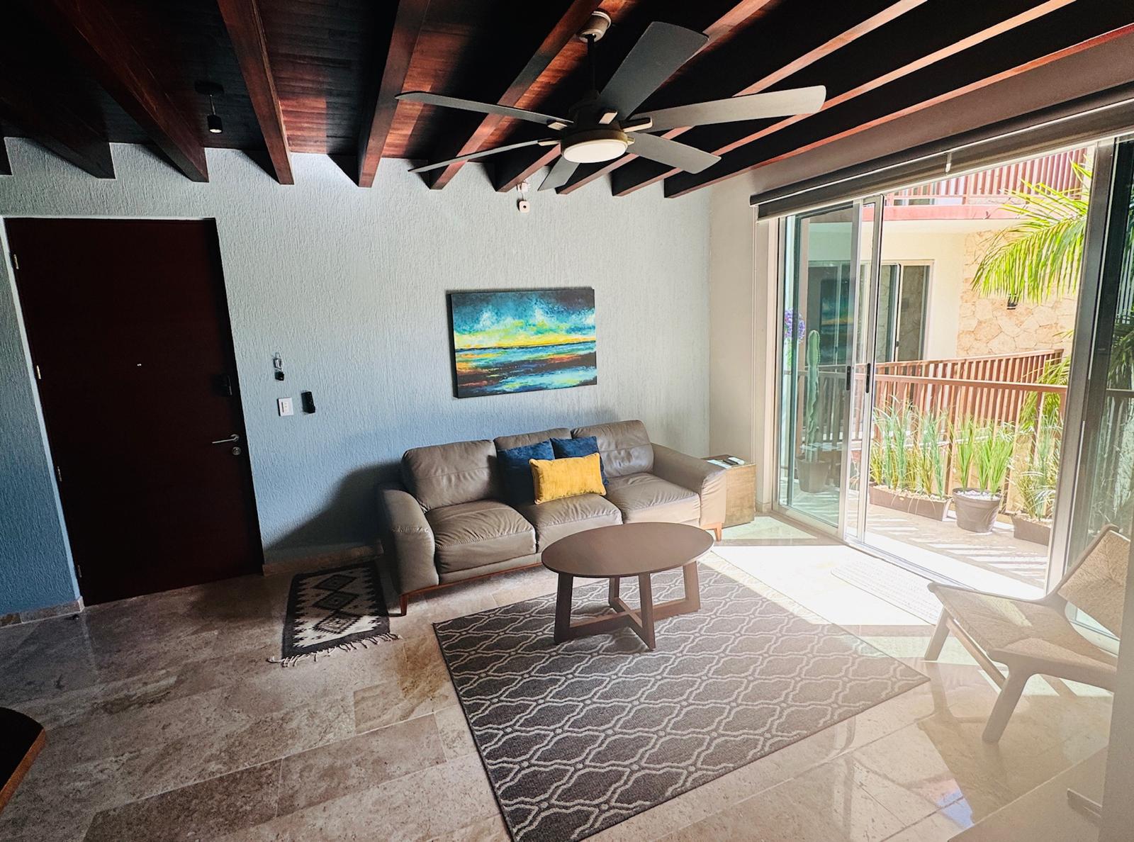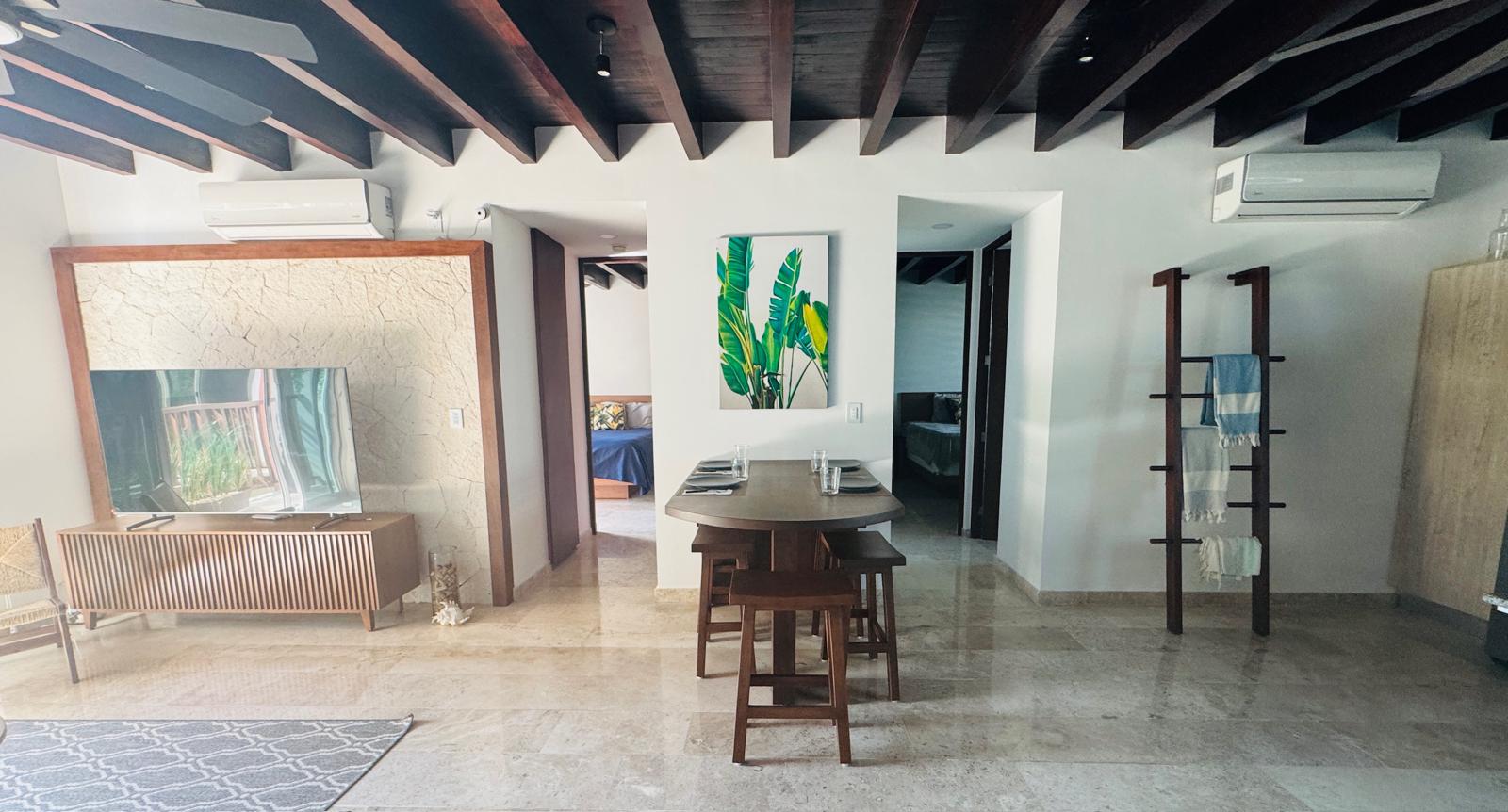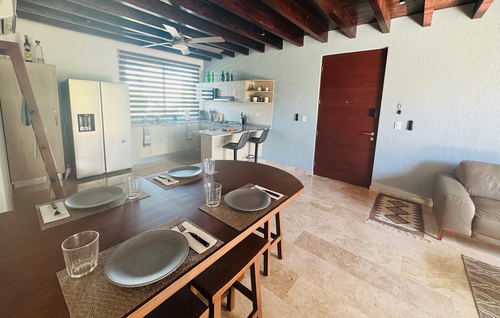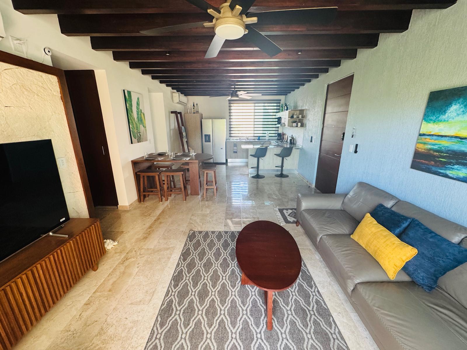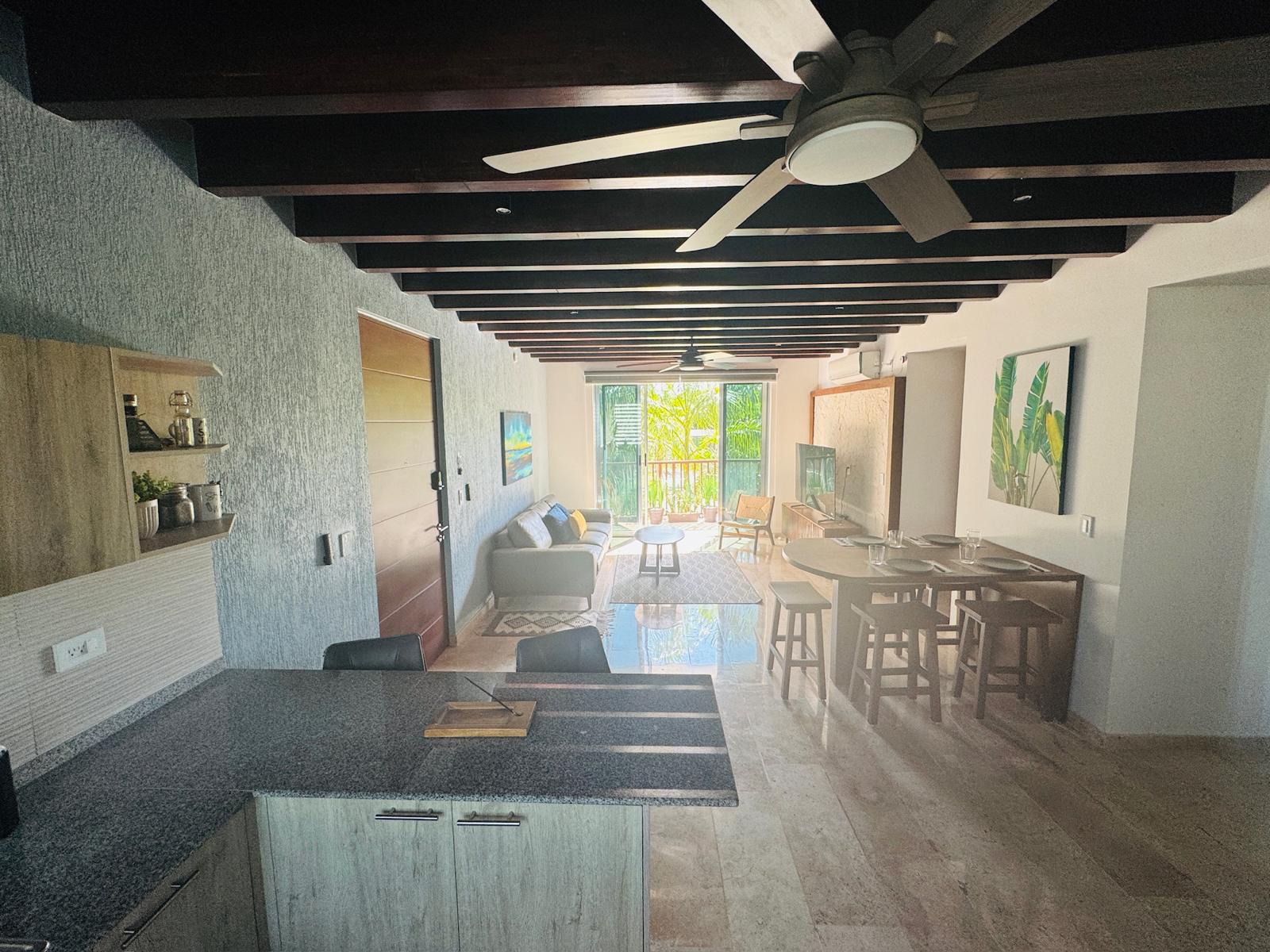 Este condominio ofrece una distribución funcional que integra sala, comedor y cocina en un espacio abierto que maximiza la iluminación y la comodidad. Cuenta con dos recámaras, dos baños completos y áreas diseñadas para brindar privacidad y confort. Además, incorpora acabados de alta calidad como pisos de mármol travertino, carpintería en madera y cocina integral equipada, creando un espacio moderno, práctico y listo para disfrutarse.